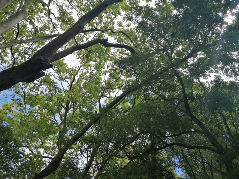 O chão está coberto de folhas secas, enquanto nas árvores a folhagem verde teima permanecer.