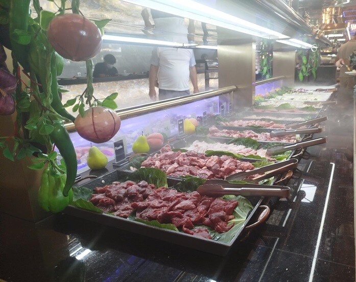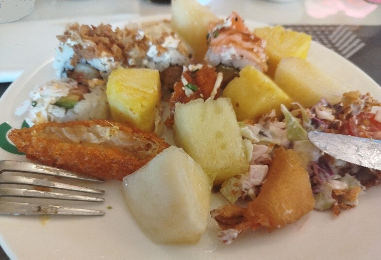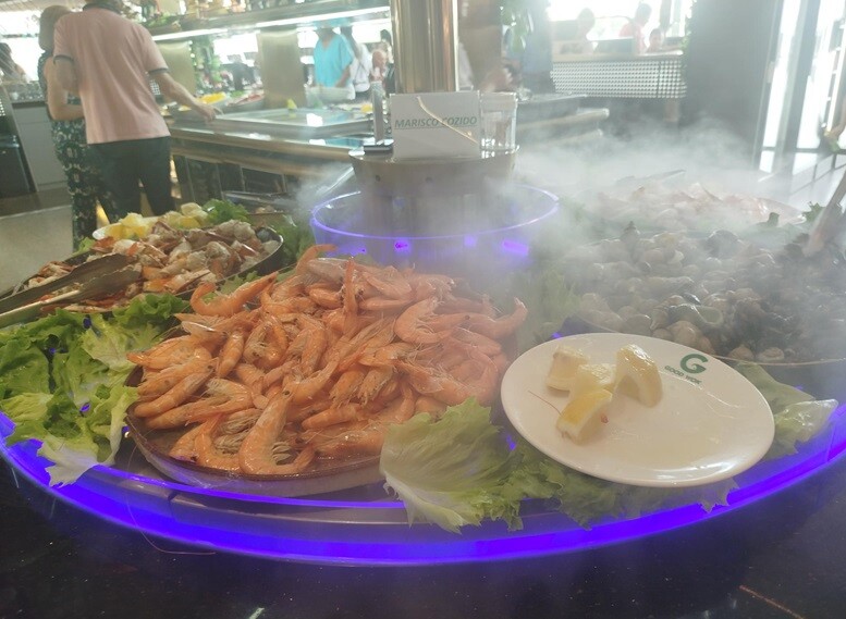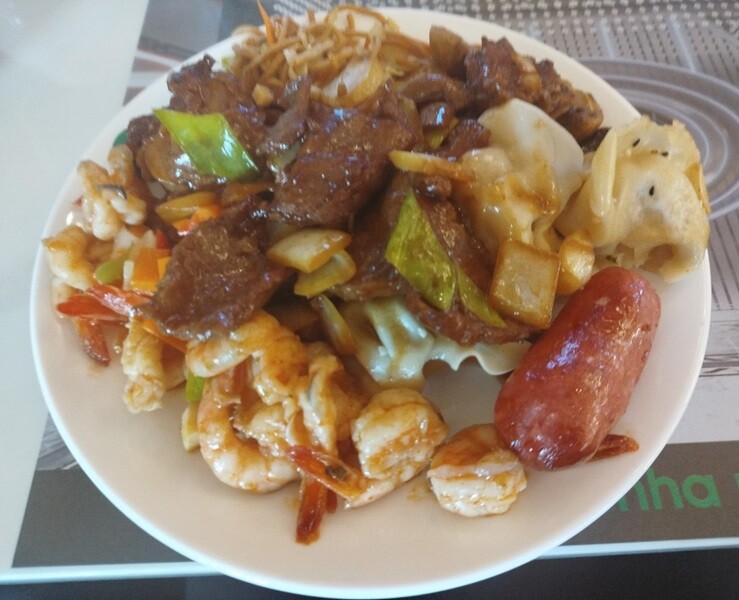 Desde as navalhas, camarões, ameijoa, mexilhão, vieiras... às lulas, chocos, à picanha. Do hambúrguer, salsicha fresca, perna de frango assada, batata frita, salada de polvo, mais e variadas saladas. Fruta diversa. Os normais fritos orientais. Crepes, rolinhos de vegetais, galinha com amêndoa, e outros. Massas, arroz, xau-xau, cogumelos, até aos "joaquinzinhos" fritos, num autêntico mundo de diversidade. Uma vasta e apelativa paleta de “sushi”, passando pelos grelhados na chapa, aos muitos doces. Imagine-se, inclusive, uma Fonte de Chocolate- E gomas.