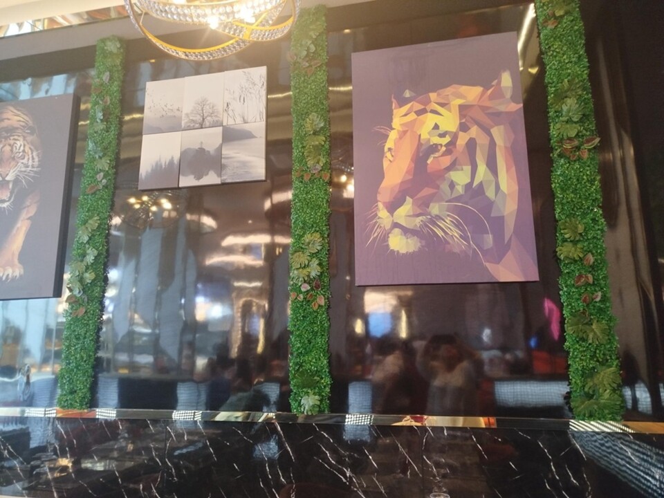 O espaço lembra um qualquer restaurante de Hong Kong, com a decoração exótica típica do oriente. Muitos néon, figuras que lembram os "desenhos animados" asiáticos. O chão assemelha-se ao mármore negro, sulcado de branco. O tecto é feito de espelhos e deste pendem candeeiros redondos, que iluminam os belos quadros de animais selvagens e demais cenas características. As cadeiras têm revestimento de cabedal sintético, em cores vivas. Como o laranja, a contrastar com algumas cinza.
